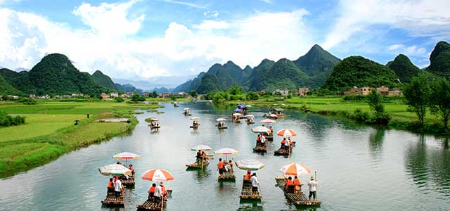 阳朔遇龙河景区在龙潭码头同时开放双人竹筏漂游和八人竹筏休闲漂两条线路,为旅客提供了丰富的选择。龙潭双人竹筏漂游线路起始于龙潭码头,终点至凤楼坝。龙潭八人竹筏休闲漂起止点均为龙潭码头